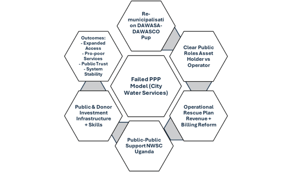 Case studies highlight viable alternatives. In Dar es Salaam, Tanzania, the 2003–2005 privatisation with City Water Services, a Biwater-led consortium, failed spectacularly, delivering no new pipes, declining service quality, falling revenues, and an eventual contract termination amid mutual accusations. The subsequent shift in 2005 to a public-public partnership between the asset holder DAWASA and the operator DAWASCO, supported by public utilities such as Uganda’s National Water and Sewerage Corporation, stabilised the system without the pressures of privatisation.